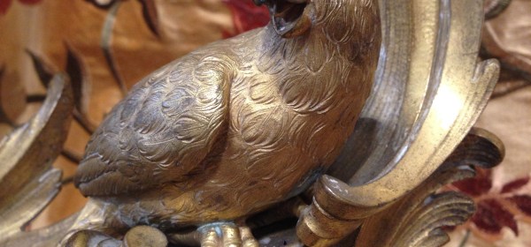 RARE PAIRE DE CHENETS AUX PERROQUETS Paris, époque Louis XV, vers 1740-1750. CHARLES CRESSENT ET JACQUES CONFESSEUR. BRONZES DORES AU MERCURE H: 24 cm