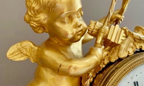 PENDULE DE CHEMINEE AU CUPIDON HORLOGER: CRONIER A PARIS BRONZE CISELE ET DORE, CADRAN EMAILLE , VERRES EPOQUE FIN TRANSITION LOUIS XV-LOUIS XVI, PARIS, VERS