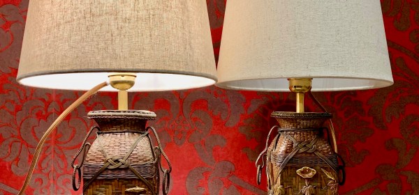 PAIRE DE LAMPES EN FORME DE PANIER TRESSE A DECOR FLORAL, PIETEMEMENT EN FORME DE BAMBOU EN MOKUME-GANE FIN DU XIXe SIECLE, JAPON, EPOQUE MEIJI
