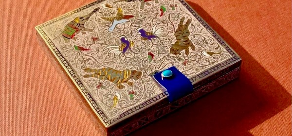 POUDRIER DECOR INDO-PERSE EN METAL DORE GRAVE A DECOR CISELE ET REHAUSSE D’UN DECOR EMAILLE POLYCHROME PERSAN COMPOSE DE TIGRES, ELEPHANTS, OISEAUX ET FLEURS. POUSSOIR