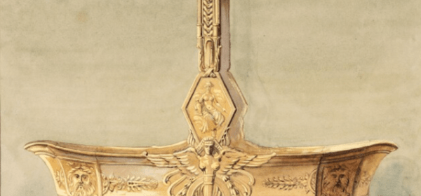 DESSIN PROJET D’UNE COUPE COUVERTE FIGURANT UNE COUPE COUVERTE A PRISES DE CYGNE ENCADRANT UN MEDAILLON CIRCULAIRE REHAUSSE DE LA REPRESENTATION D’UN MASQUE D’HOMME MYTHOLOGIQUE