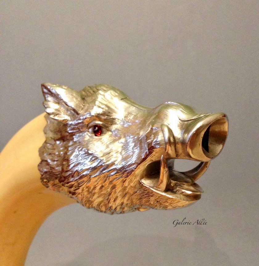 Magnifique et rare coupe-cigare formé d’une défense de sanglier en ivoire montée avec une tête de sanglier en argent, provenance Autriche-Hongrie, début 20 ème siècle.
