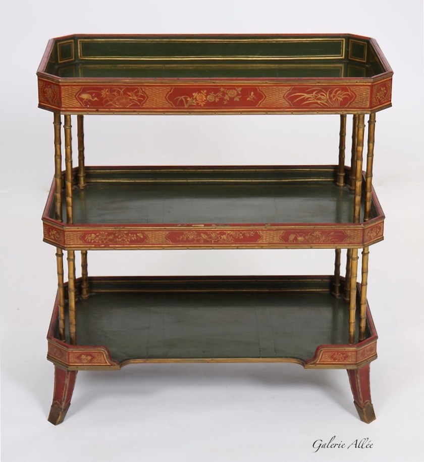 Les trois plateaux sont décorés de laque de chine rouge à décor, vert, or et ceinturés par des baguettes en bronze doré . Les montants, à doubles colonnettes, imitent des tiges de bambou. L’ensemble de la composition repose sur quatre pieds sabre ornés de bronze doré. C’est Adam Weisweiler qui créa ce type de mobilier original à décor de bambous, référence au goût exotisme. Le Musée des Arts Décoratifs de Paris conserve un dessin préparatoire à la réalisation d’un guéridon qui fut destiné au Comte Skawrousky . On y retrouve nos montants à doubles colonnettes imitant le bambou.