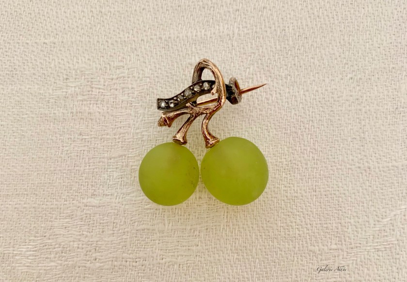 Attribué à FONSEQUE & OLIVE – Broche en or 18K 750‰ et argent 2nd titre 800‰, représentant une grappe de raisin chasselas en verre vert, la tige sertie de diamants de taille rose. Modèle créé en 1889