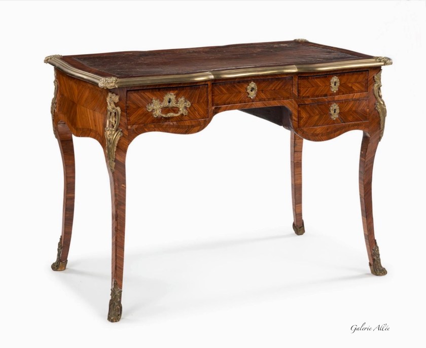 Bureau plat vers 1720-1730 asymétrique à décor de marqueterie en bois de violette. Le plateau couvert d’un maroquin de couleur lie de vin encadré d’une frise de placage en chevrons . Il est cintré par une large lingotière mouvementée, les angles ornés décoinçons. La ceinture est fortement mouvementée sur quatre faces et présente un très beau jeu de placage dans des encadrements ; elle ouvre en façade par trois tiroirs dont celui de droite à deux tiroirs, ceux du centre et de gauche à un tiroir. Elle repose sur quatre pieds fortement galbés à pans coupés. Le tout est orné d’une ornementation de bronzes finement ciselés et dorés.