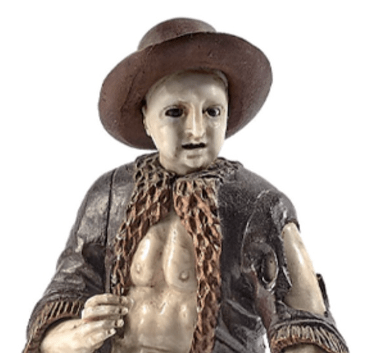 DEBOUT SUR UNE TERRASSE NATURALISTE, COIFFE D’UN CHAPEAU A LARGES BORDS ET VETU DE HAILLONS DECOUVRANT SON TORSE.