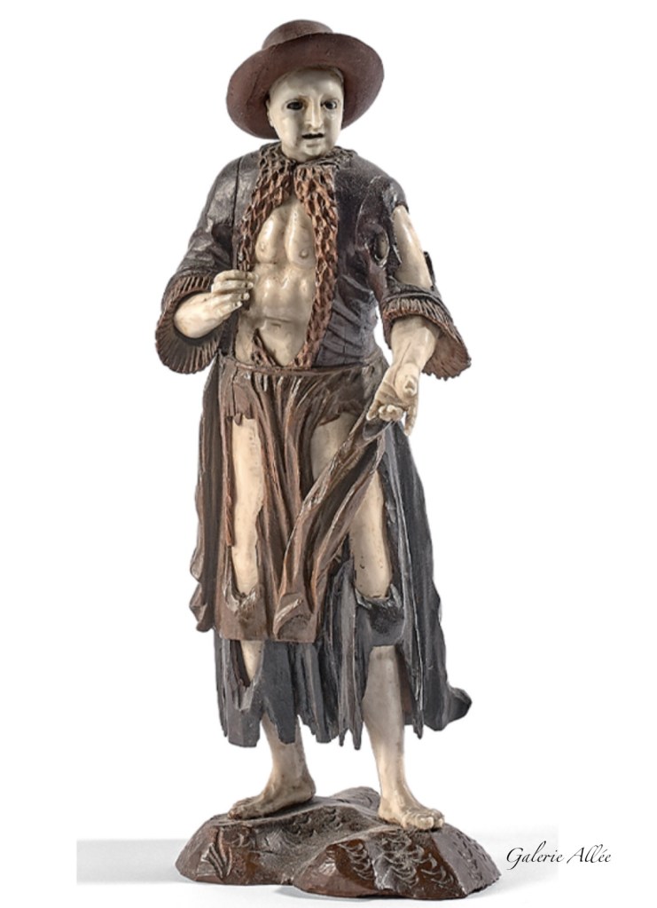 MENDIANT EN IVOIRE ET TILLEUL SCULPTE EN RONDE-BOSSE AVEC LES YEUX EN VERRE.