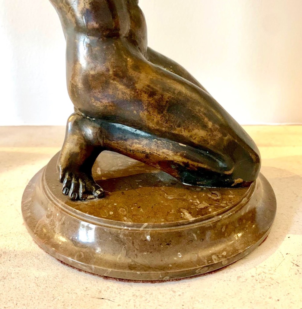 EN BRONZE CISELE DORE, A DECOR D’ATLAS EN BRONZE PATINE REPOSANT SUR UNE BASE CIRCULAIRE EN GRANITE VERT