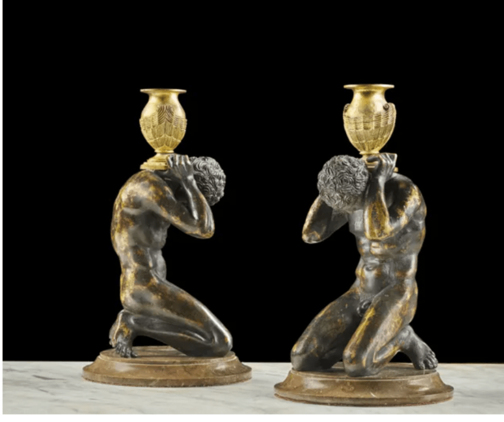 Ces bougeoirs appartiennent probablement à un petit groupe fabriqué a Saint- Pétersbourg vers 1801-1805. On pense qu’ils ont été réalisés par le plus célèbre des bronziers russes Friedrich Bergenfeldt d’après le dessin exécuté par Andrei Voronikhin.