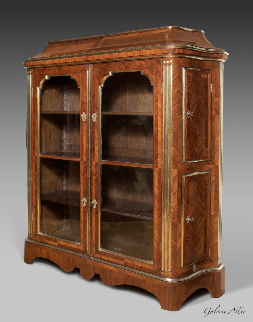 Entrées de serrures à coquille sur les portes vitrées et en losange sur les portes latérales en bronze ciselé et doré.