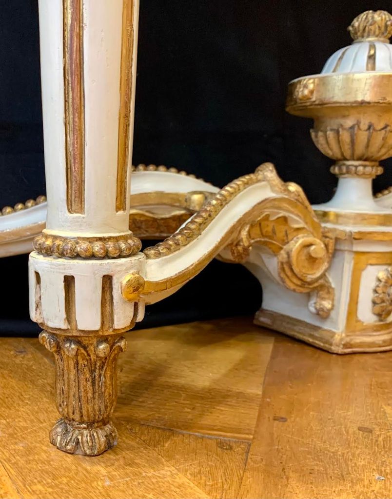PIEDS FUSELES A CANNELURES A ASPERGES CINTRES D’UNE MAGNIFIQUE ENTRETOISE. L’ENTRETOISE EST SCULPTEE DE PERLES ET D’ENROULEMENTS, AU CENTRE CASSOLETTE NEOCLASSIQUE AU TOURNESOL.
