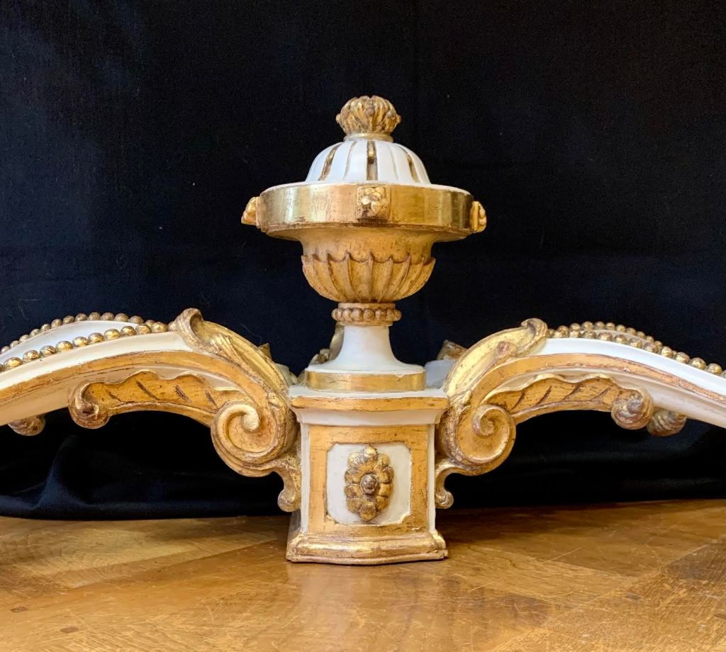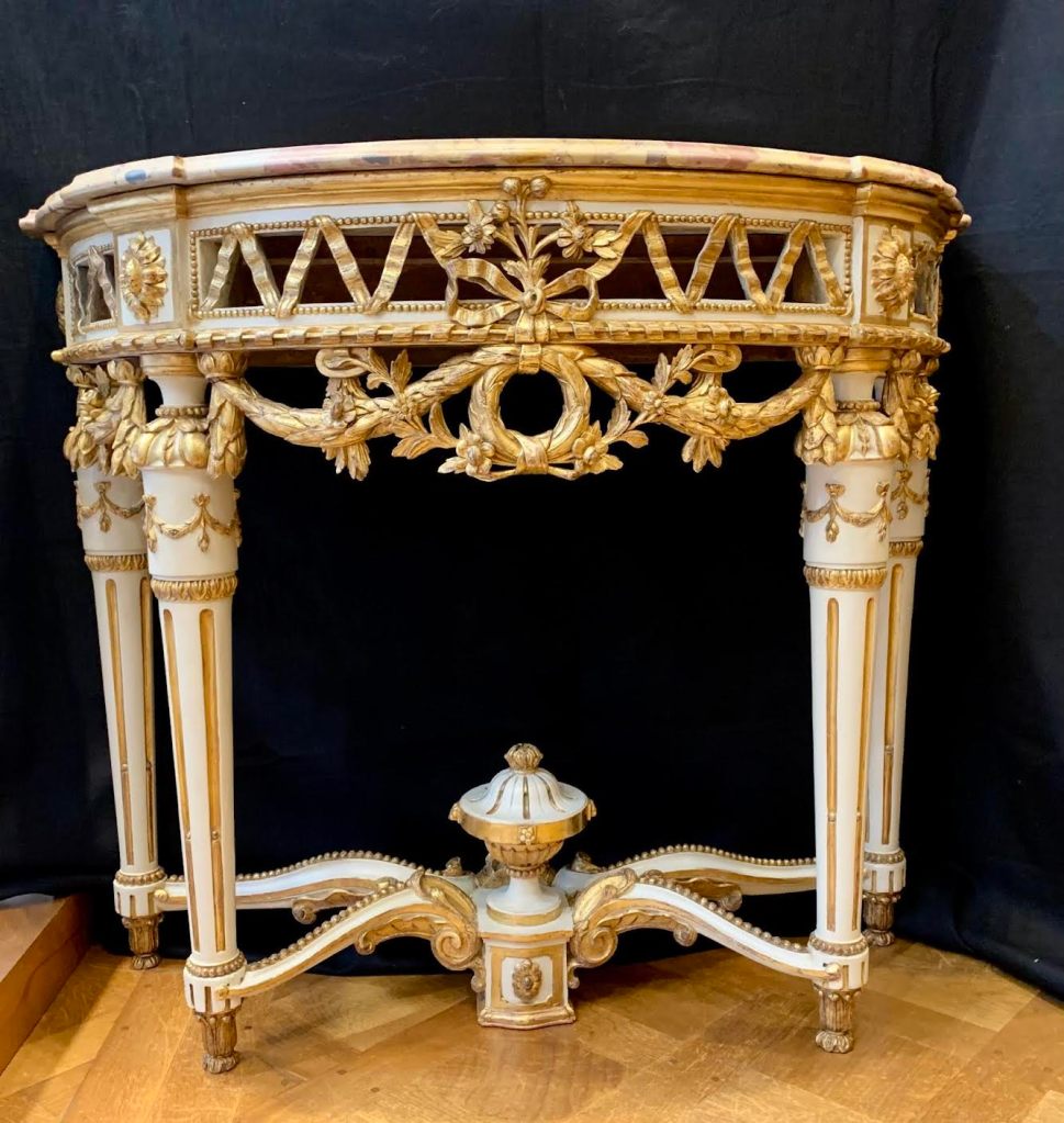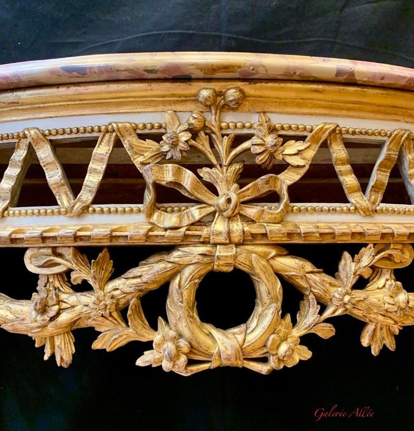 PAIRE DE CONSOLES DE FORME DEMI-LUNE EN BOIS SCULPTE DORE ET LAQUE BEIGE. LA CEINTURE EST AJOUREE, ELLE PRESENTE SUR LES DES DES TOURNESOLS, ENCADREMENT AJOURE DE DESSINS GEOMETRIQUE AVEC PERLES, EN SONCENTRE UN NOEUD D’OU S’ECHAPPE UNE GERBE DE FLEURS, SUR LE DESSUS UNE GUIRLANDE DE FLEURS.