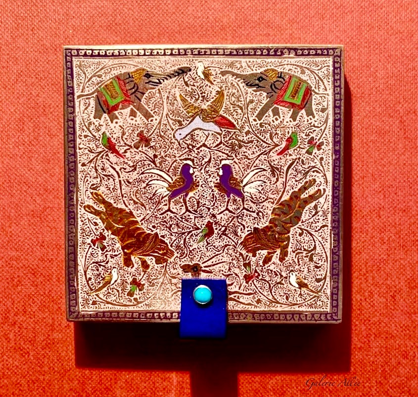 EN METAL DORE GRAVE A DECOR CISELE ET REHAUSSE D’UN DECOR EMAILLE POLYCHROME PERSAN COMPOSE DE TIGRES, ELEPHANTS, OISEAUX ET FLEURS. POUSSOIR EN LAPIS LAZULI ET CABOCHON EN TURQUOISE.