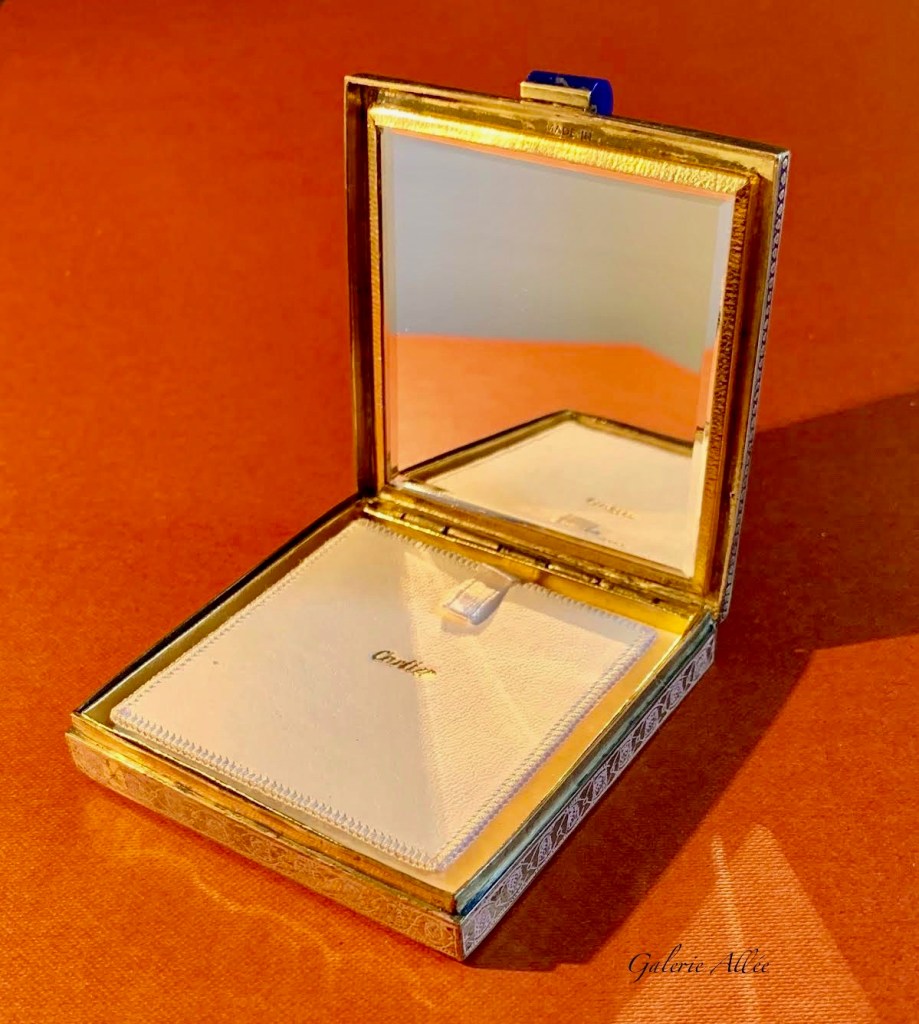 Ce type de décor est connu sous la forme de boites de beauté, minaudières, de poudriers, de nécessaires, d’étuis à rouge à lèvres mais notre poudrier à fond rose fut certainement commandé spécialement à la demande d’une cliente raffinée et avertie à la maison Cartier dans les années 1930.