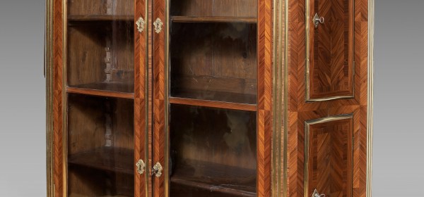 BIBLIOTHEQUE EPOQUE REGENCE, FRANCE PLACAGE DE BOIS DE VIOLETTE, PALISSANDRE, LAITON, BRONZE CISELE ET DORE ESTAMPILLE PIERRE MIGEON, JME H: 170 cm – L: 162