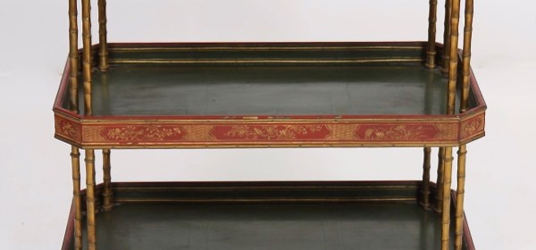 TABLE TRICOTEUSE LAQUE ROUGE, VERT ET OR CHINE EPOQUE QIANLONG; BRONZE CISELE ET DORE A L’IMITATION DU BAMBOU. ATTRIBUEE A ADAM WEISWEILER ( 1746 – 1820