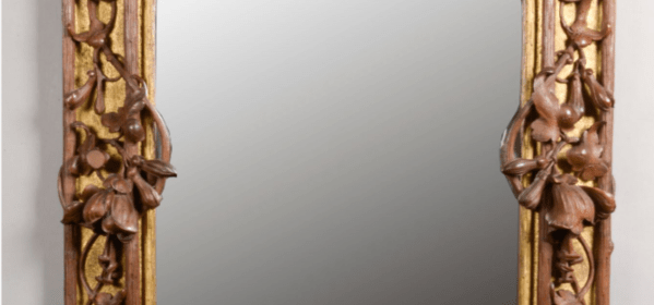 MIROIR REPRESENTANT LA CHASSE, SCULPTE EN HAUT RELIEF D’UN OISEAU, DEUX TETES DE CHIEN ET DE BRANCHAGE FEUILLAGES ET FLEURIS SUR FOND OR.