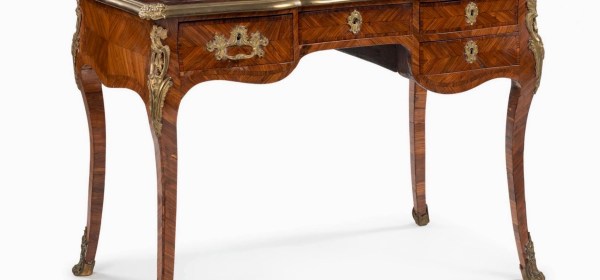 BUREAU PLAT EN PLACAGE DE BOIS DE VIOLETTE SUR BATI DE CHENE ORNEMENTATION DE BRONZE CISELE ET DORE MAROQUIN DE COULEUR LIE DE VIN ATTRIBUE