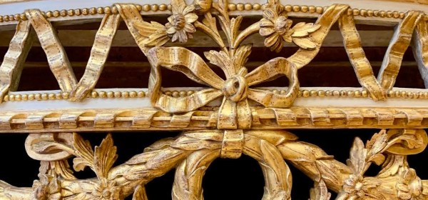 PAIRE DE CONSOLES DE FORME DEMI-LUNE EN BOIS SCULPTE DORE ET LAQUE BEIGE. LA CEINTURE EST AJOUREE, ELLE PRESENTE SUR LES DES DES TOURNESOLS, ENCADREMENT