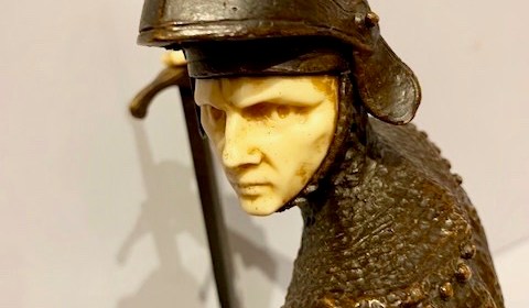 CHEVALIER NEOGOTHIQUESCULPTURE EN BRONZE, OS ET CUIVRE SIGNEE L.MADRASSI ( 1848 – 1919 ) PARIS FIN XIX ème SIECLE H: 31 P: 20 L: 20