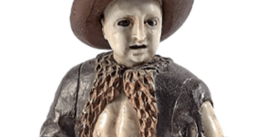 MENDIANT EN IVOIRE ET TILLEUL SCULPTE EN RONDE-BOSSE AVEC LES YEUX EN VERRE. DEBOUT SUR UNE TERRASSE NATURALISTE, COIFFE D’UN CHAPEAU A LARGES BORDS ET