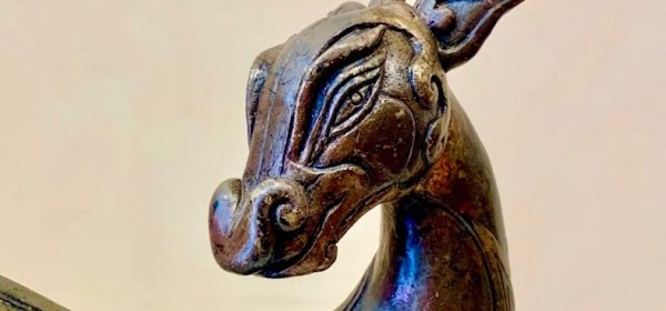 SCULPTURE QILIN REPRESENTE A L’ARRET, LA TETE TOURNEE VERS L’ARRIERE BRONZE, TRACES DE LAQUE D’OR CHINE XVIIe SIECLE SOCLE MODERNE H: 30 cm – L:
